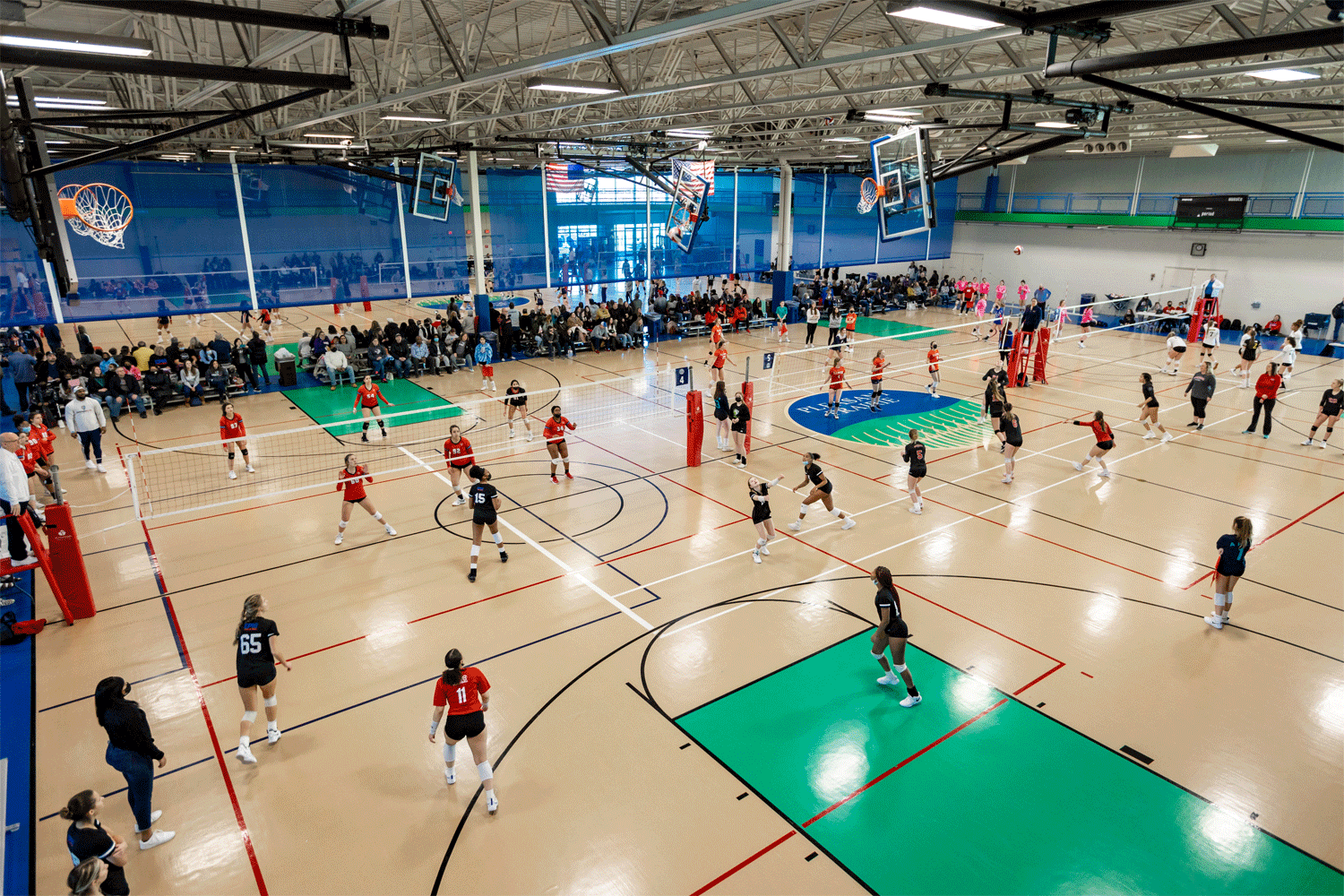 - Justagame Fieldhouse offers six basketball courts and nine volleyball courts
