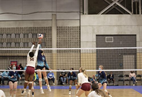 A volleyball tournament taking place at the Roland E. Powell Convention Center.