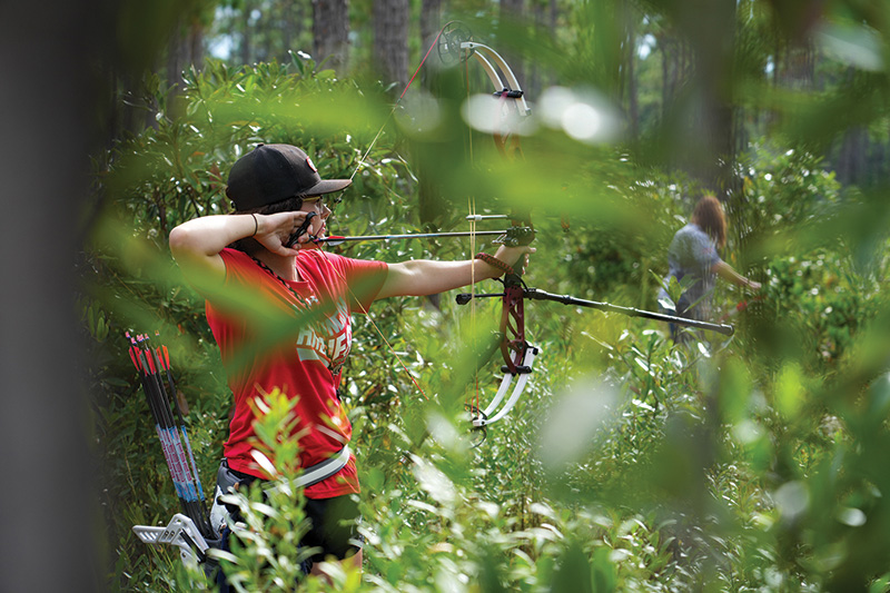 Thompson says the key to a great archery event is a unique space that can adjust year to year. Graham Creek Nature Preserve, where the majority of Foley’s archery events are hosted, is more than 500 acres, housing more than a dozen ranges and hundreds of lanes. ASA events usually require about 250 acres to accommodate 17 ranges, and collegiate events require about 150 acres to accommodate about seven ranges, he says. Each range is home to 20 lanes with space for safety buffers. The placement of targets and lane setups changes year by year to keep the competition challenging and fun.