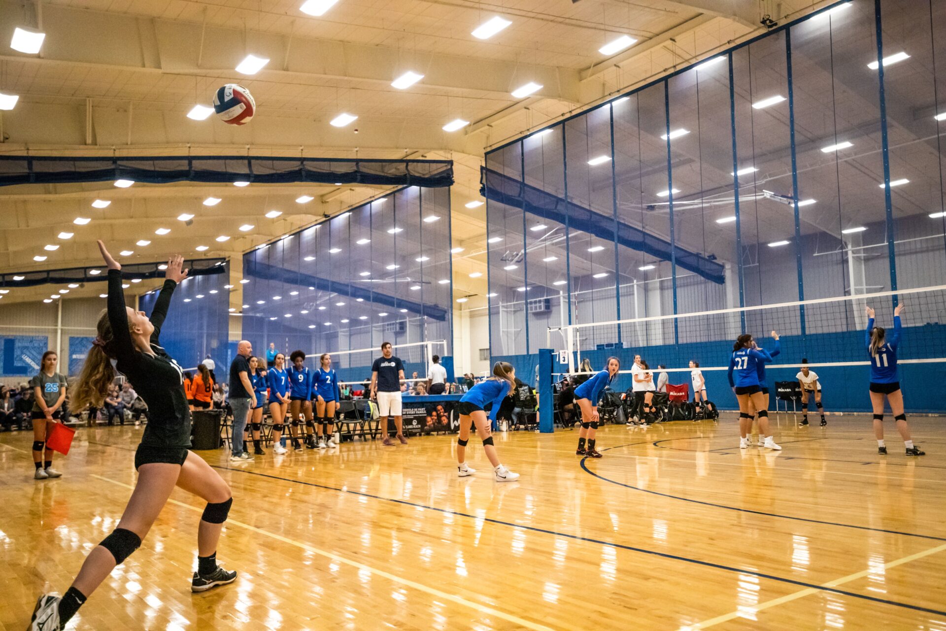 Indoor volleyball can be hosted in school gyms, collegiate arenas, or multi-court complexes.