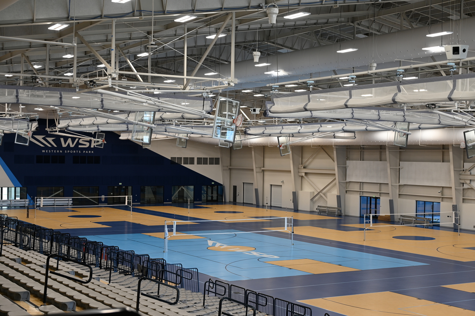 Western Sports Park features two large arenas with flexible layouts. The primary arena boasts Taraflex flooring throughout and houses nine permanent courts, delivering optimal safety, performance, and visual appeal for competitive volleyball events. The second arena has a polished concrete floor, ideal for setting up Sport Court surfacing as needed. With additional portable equipment, both arenas can accommodate up to 24 total volleyball courts, making Western Sports Park an outstanding choice for large tournaments and multi-day competitions.